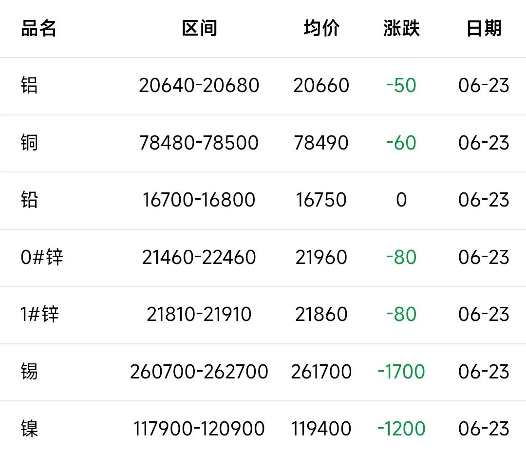23日有色宝长江A00铝20640~20680均价20660跌50,前三日均价20800,前五日均价20726